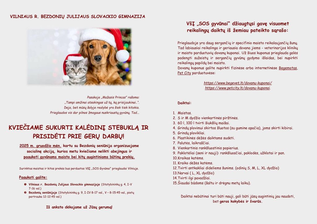 Trečiadienį, lapkričio 19 d., mūsų gimnazijoje šventėme Globėjo Julijaus Slovackio dieną. Ta proga II aukšto fojė virto ypatinga erdve, kupina literatūros, muzikos ir kūrybinės atmosferos. Pertraukų metu mokiniai galėjo dalyvauti įvairiose veiklose, parengtose specialiai šiai progai. Fone skambėjo Slovackio eilės ir Marko Grechutos dainos, kurios kūrė jaukią nuotaiką ir kvietė bent akimirkai sustoti prie čia įsikūrusios parodos. Mokiniai susidomėję apžiūrinėjo eksponuojamas J. Slovackio knygas ir savo bendraklasių sukurtus meninius darbus. Didelio dėmesio sulaukė „globėjo medelis“, prie kurio mokiniai galėjo nusifotografuoti bei palikti savo linkėjimus. Netrukus medelis prisipildė spalvingų žinučių gimnazijos globėjui. 5–10 klasių mokiniai konkurso „Julijaus diktantas“ nugalėtojai buvo apdovanoti diplomais.